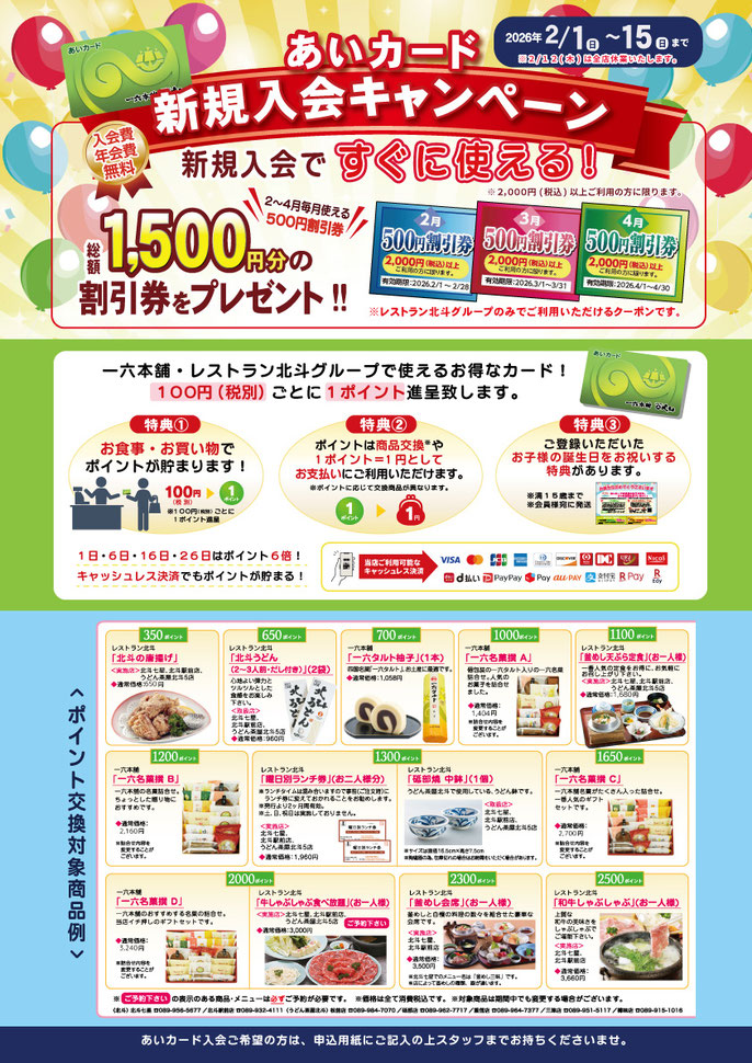 レストラン北斗グループ各店にて「あいカード新規入会キャンペーン」を実施致します。