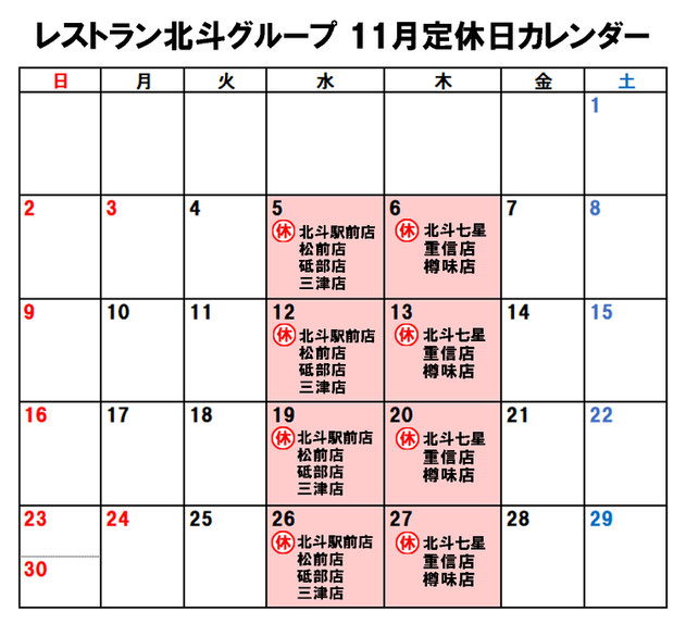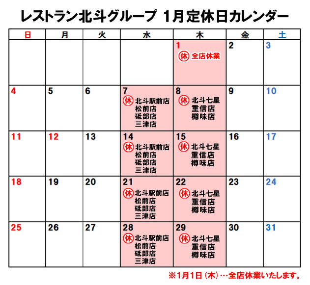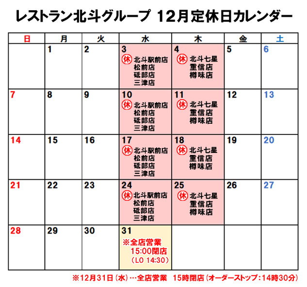 レストラン北斗グループ定休日は以下の通りとなっております。