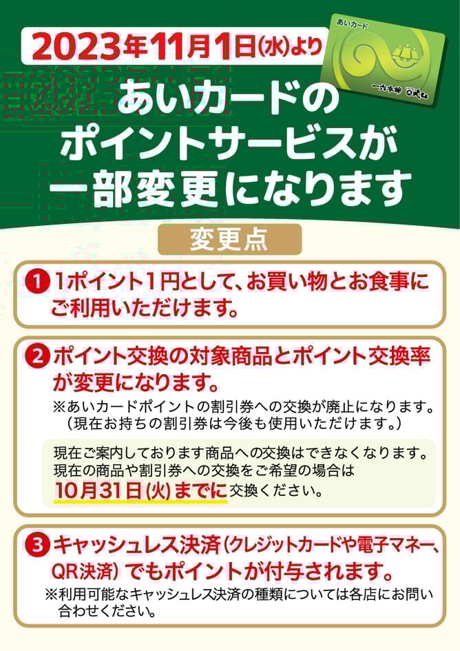 ポイントの失効は致しません。10月末までは今まで通り商品や割引券との交換となり、11月からは商品交換・1ポイント1円として支払いにご使用いただけます。