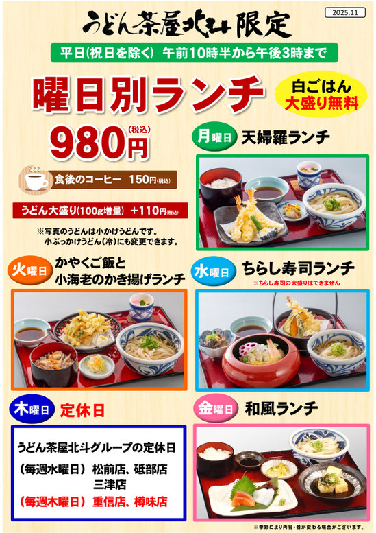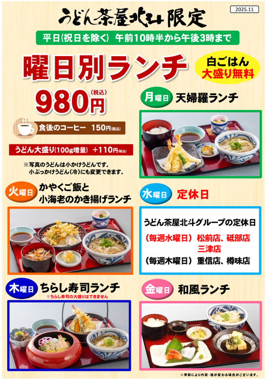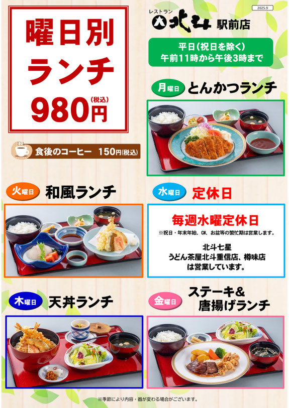 ※「釜めし曜日別ランチ」は北斗七星限定となります。