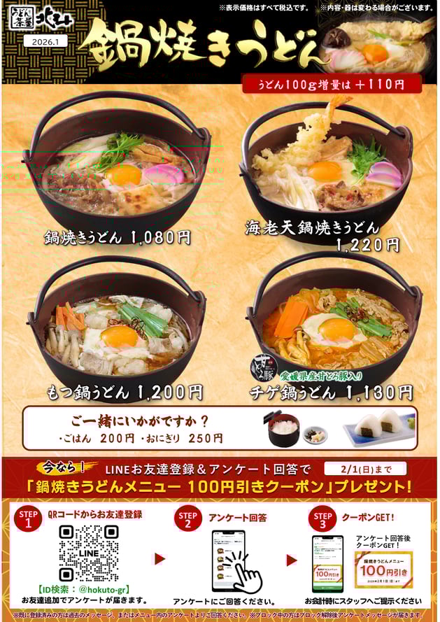 1/13(火)より、うどん茶屋北斗各店にて「鍋焼きうどんフェア」を実施致します。 更に!今ならレストラン北斗LINEアカウントに友だち登録をいただき、アンケートに回答をいただくと【鍋焼きうどんメニュー100円引きクーポン】をプレゼント! LINE友だち登録はこちらから⇨レストラン北斗LINE公式アカウント(ID:@hokuto-gr)...