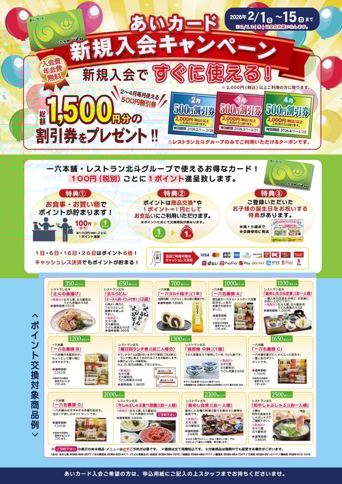 2月1日(日)~2月15日(日)の期間中、 レストラン北斗グループ各店にて「あいカード新規入会キャンペーン」を実施致します(※2/12(木)は全店休業いたします) 期間中にレストラン北斗グループ各店にてあいカードにご入会された方に、 入会特典として2・3・4月の3ヶ月間、毎月使える500円割引券を総額1,500円分プレゼントいたします。...