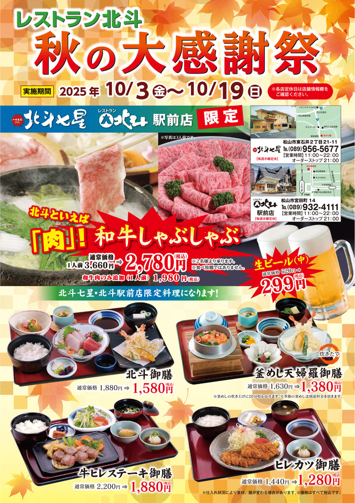 いつもレストラン北斗グループをご利用頂きありがとうございます。 昨今、原材料・人件費の高騰が続いており、従来の価格の維持が困難なことから 誠に勝手ながら2025年3月3日(月)より北斗全店にて下記の通り曜日別ランチの価格を改定させて頂きます。 ■曜日別ランチ 980円(税込) 対象店舗:北斗全店(北斗七星・北斗駅前店・うどん茶屋北斗...